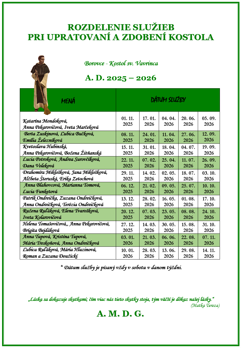 ROZDELENIE SLUŽIEB PRI UPRATOVANÍ A ZDOBENÍ KOSTOLA